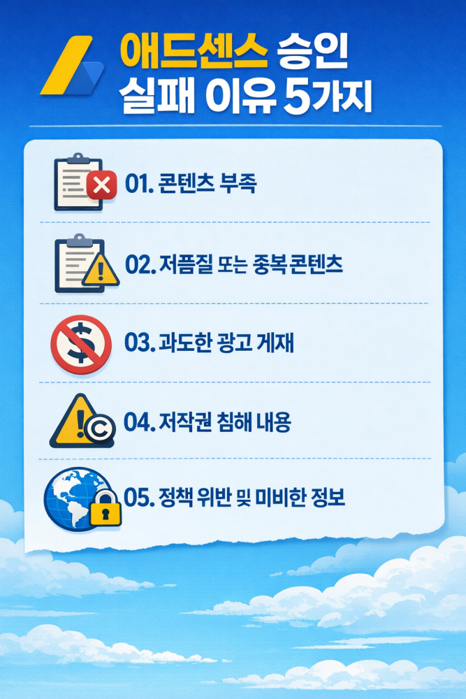 애드센스 승인이 안 되는 핵심 이유 5가지를 초보자 기준으로 쉽게 정리했습니다. 빠르게 승인 원인을 확인하고 싶다면 아래 버튼에서 확인하세요.