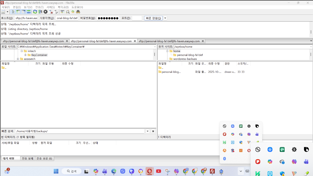 이후 오른쪽 창(원격 사이트)에서 /wptbox/home/ 경로로 이동하자 personal-blog-fa1 def 폴더와 wordpress-backups 폴더가 함께 보였습니다. 이 화면을 확인하는 순간, “아, 백업 파일은 여기에서 관리되는구나”라는 것이 명확해졌습니다.
